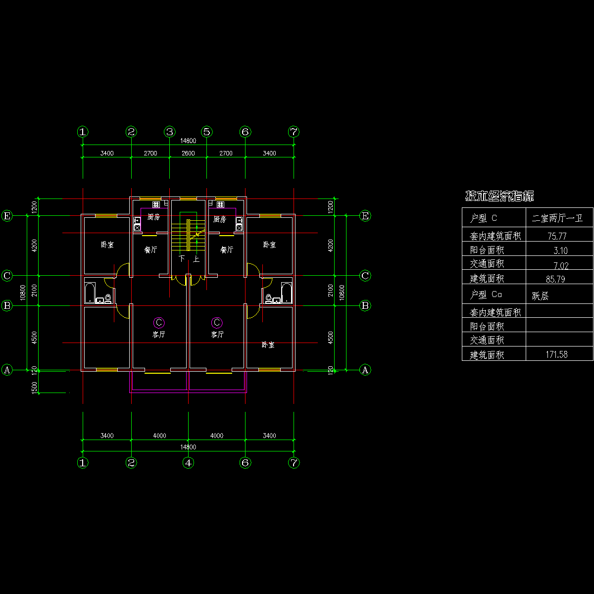 - 板式多层有跃层一梯两户户型CAD图纸