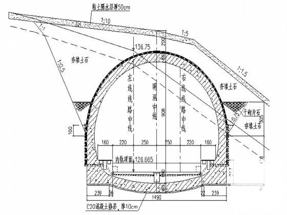 从路基引入,隧道全长181m,出口为路基段。本隧道处于左偏的缓和曲线上、左线曲线半径7000米,隧道内纵坡为单面上坡、坡率为9.5‰。