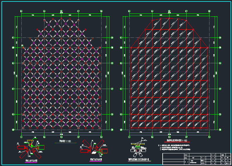 - 正放四角锥球壳网架结构CAD施工图纸(、14张)