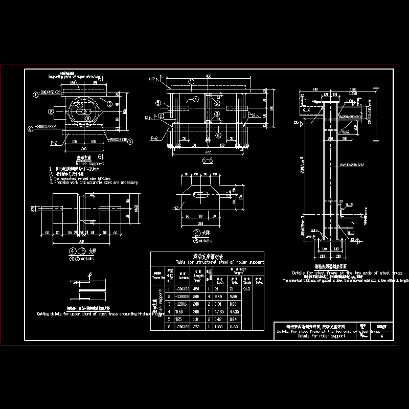 钢桁架两端钢架CAD详图纸、滚动支座CAD详图纸