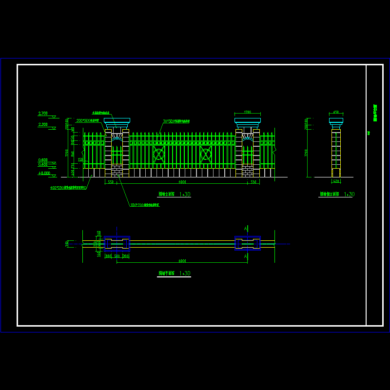 铁艺围墙施工图纸平面图及立面图、剖面图